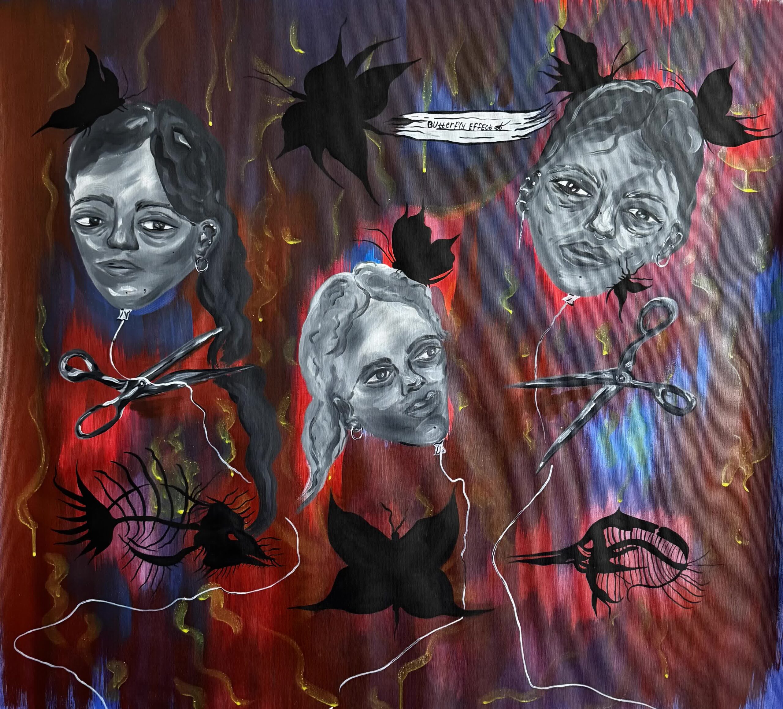 There are many versions of me, and none feel familiar. I try to love who I am, but I don’t understand her. Sometimes I fear her, sometimes I hate her. I’m an alien to my own mind. Three balloon-selfs float apart, scissors cut thread and hair — symbols of transformation or escape. Butterflies hover like ghosts of the past, or maybe pieces of light I once had. Fish skeletons hunt the biggest butterfly — the fragile self I try to protect. Medium: Mixed media on canvas Dimensions: 85×80 cm Year: 2025
