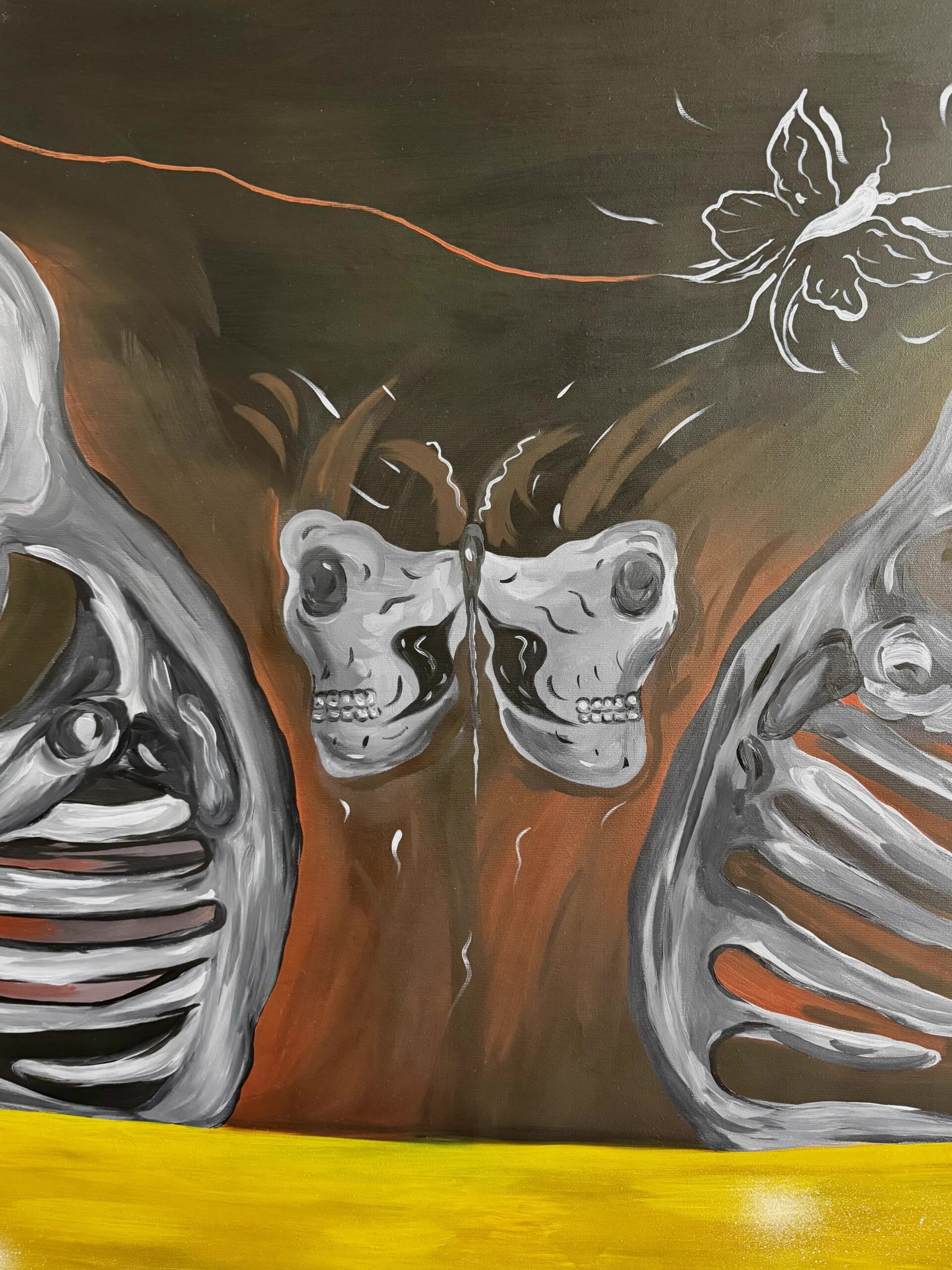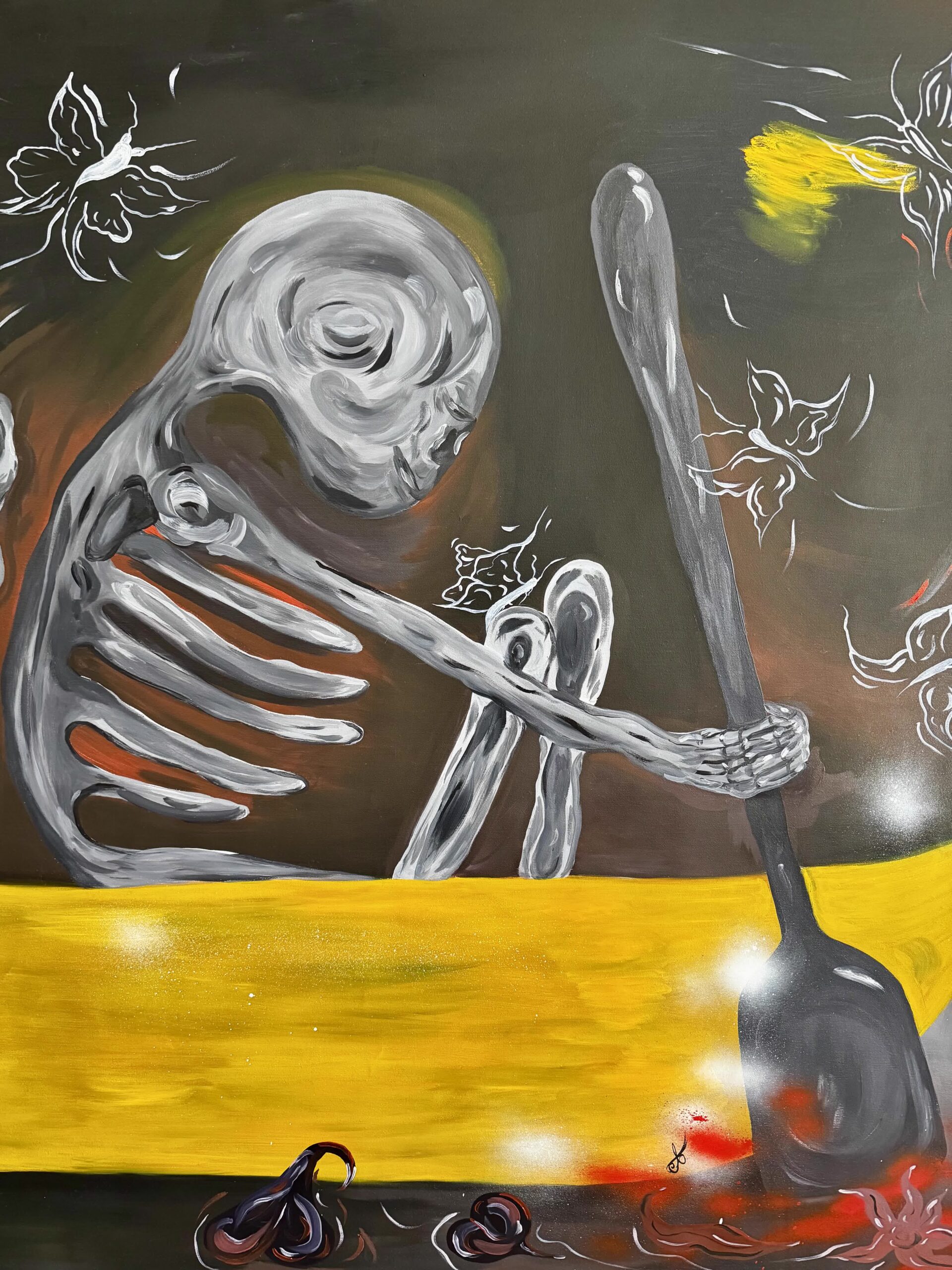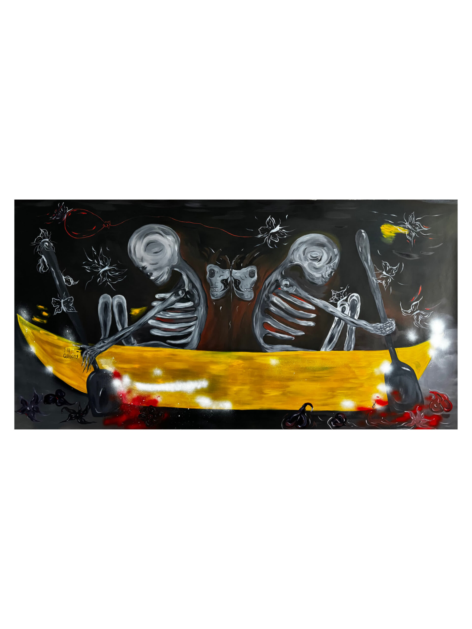 We’re in the same boat, but we’re rowing in opposite directions. So we either stay stuck in place, or tip over. There’s blood in the river, but the butterflies are still here. Medium: Oil, and spray paint on canvas Dimensions: 210×110 cm Year: 2025