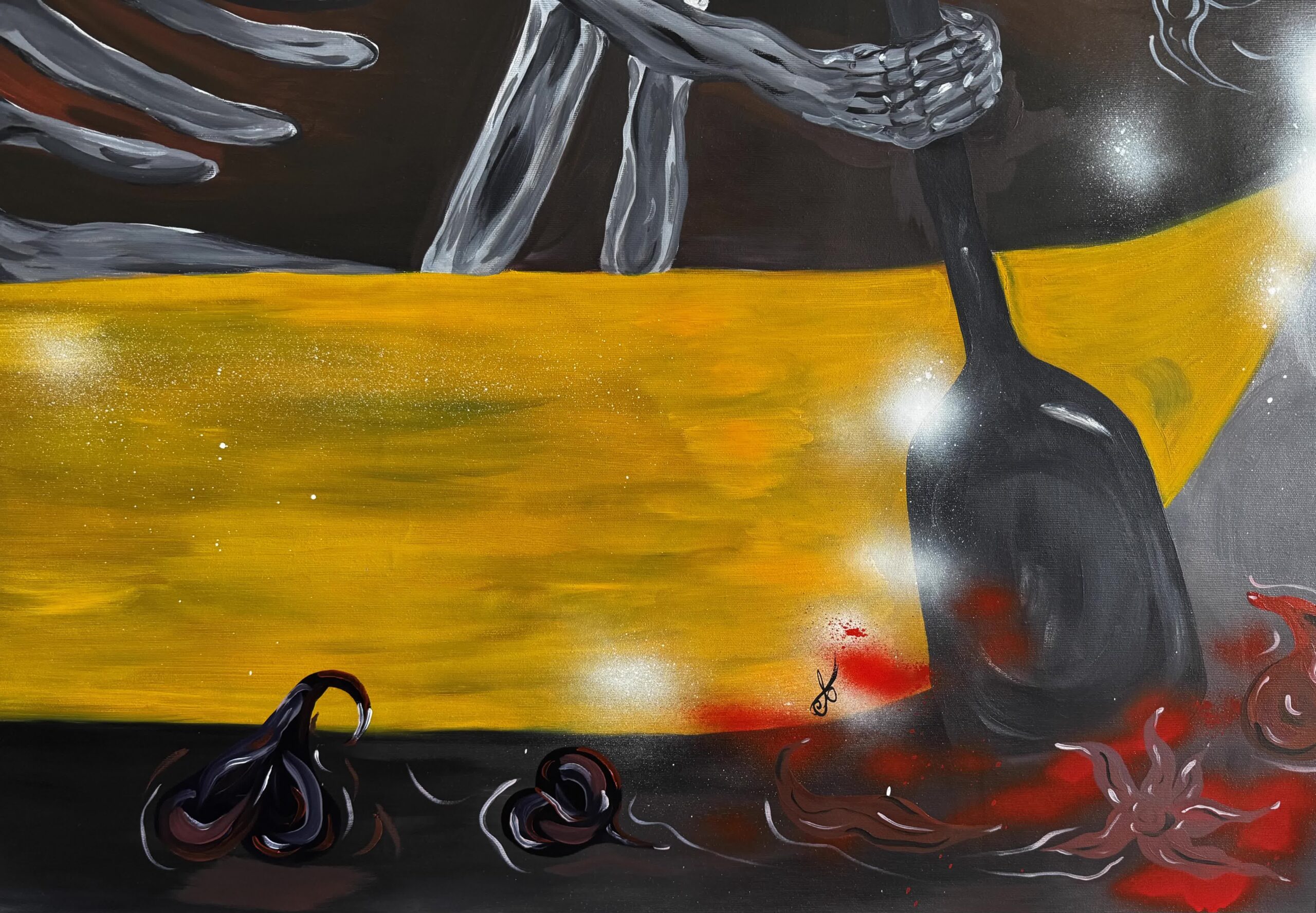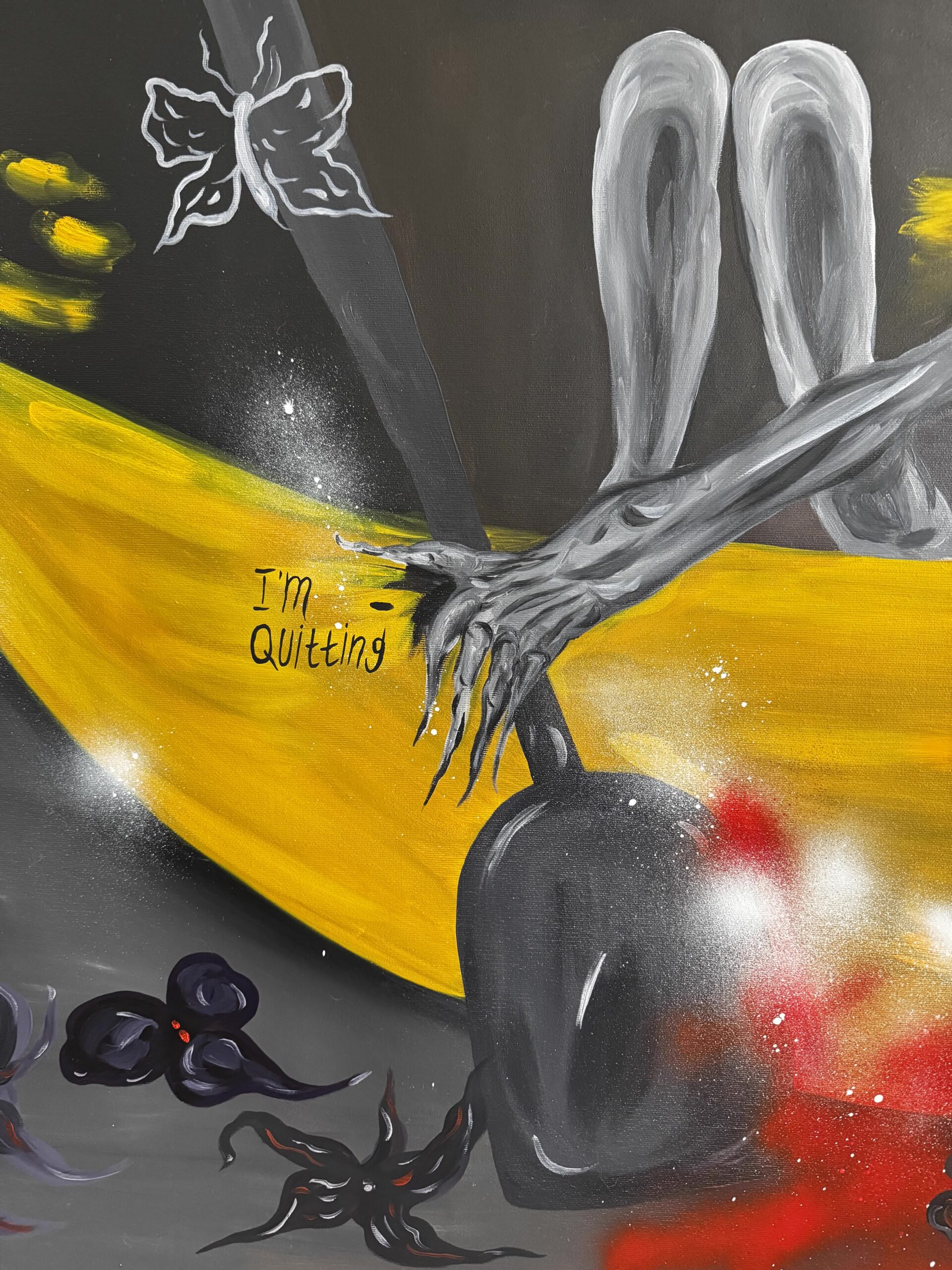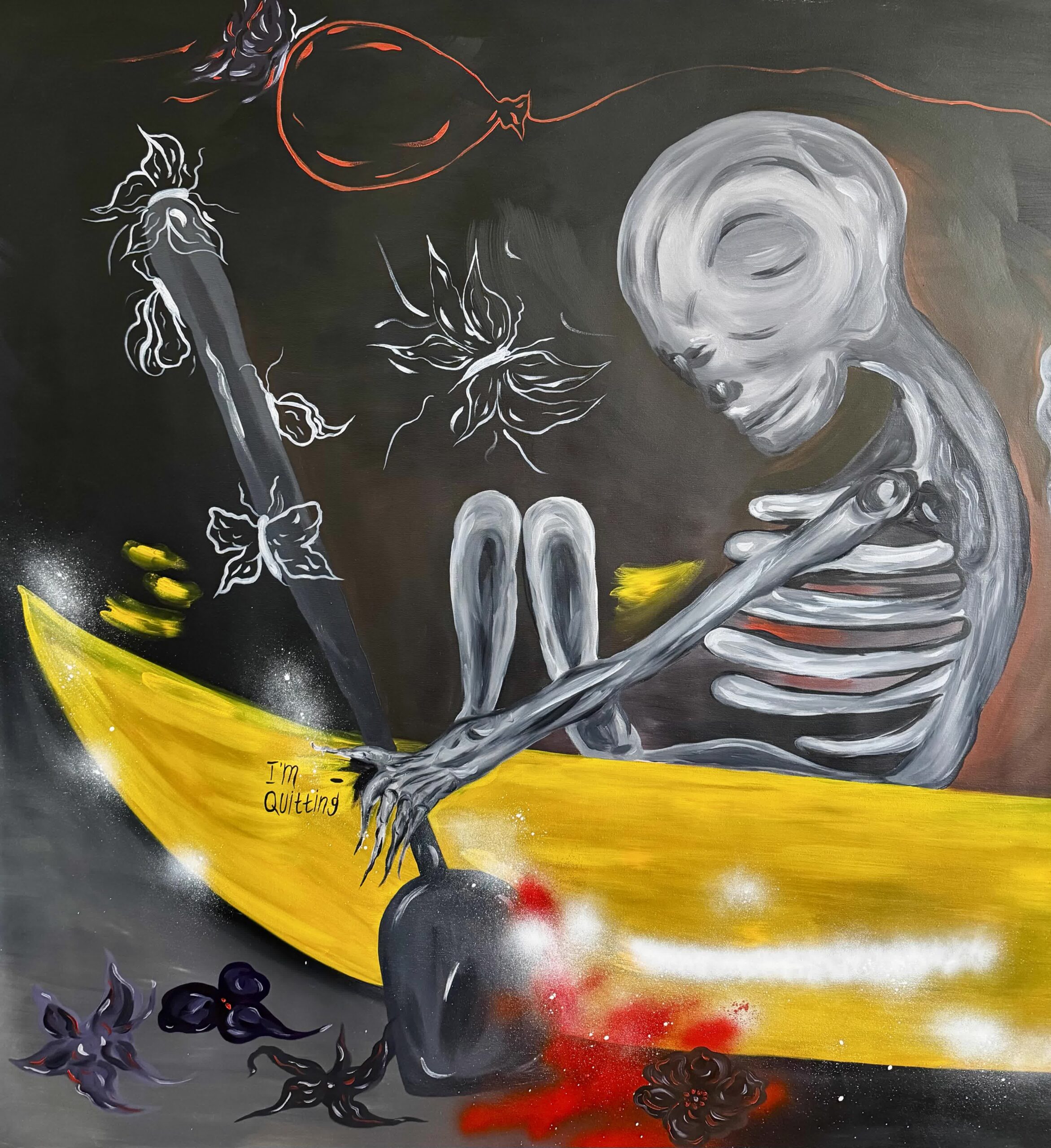 We’re in the same boat, but we’re rowing in opposite directions. So we either stay stuck in place, or tip over. There’s blood in the river, but the butterflies are still here. Medium: Oil, and spray paint on canvas Dimensions: 210×110 cm Year: 2025