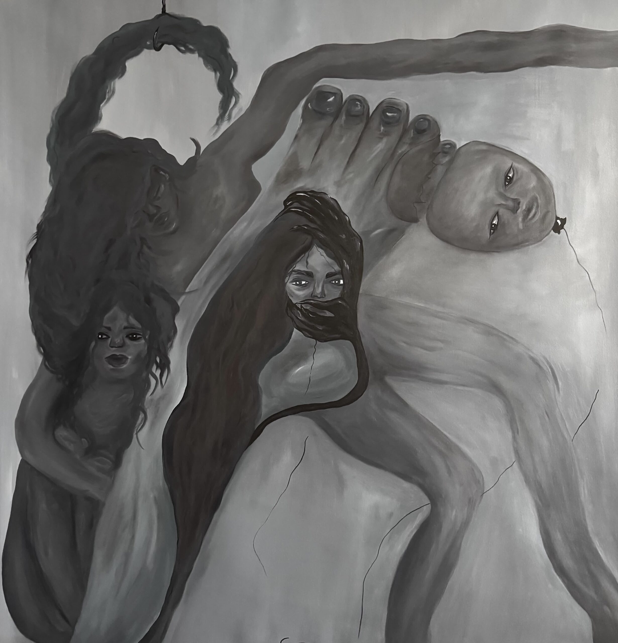 Description: I scream. I scream as loud as I can, as long as my breath can take. I bite those hands that are shutting my mouth. I knock, I kick, I try to break the cage. There’s no cage — it’s just my feet. I’m my cage, and I’m those hands. Medium: Oil on canvas Dimensions: 100×100 cm Year: 2025